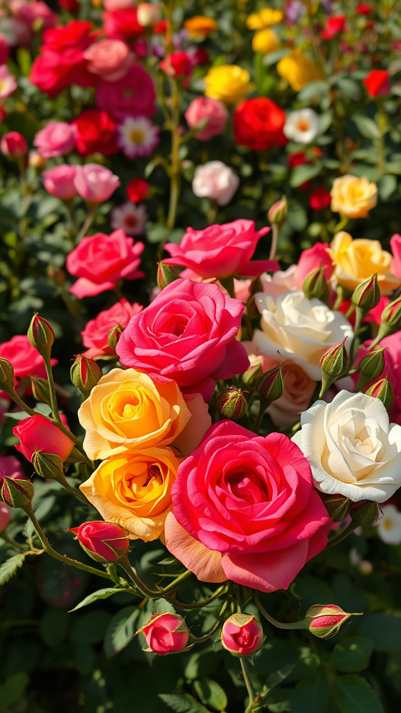 A vibrant display of roses in full bloom, coupled with tender rose buds in a lush flower garden surrounded by vivid colors. The scene captures a harmonious blend of red, pink, yellow, and white roses under the gentle glow of morning light. Photographed with a DSLR using a 70mm lens, the composition boasts intricate shadow effects, shot at f/22 from a high angle perspective. The image is rendered in 8k, achieving photorealistic and hyper-detailed quality with subtle uplighting, maintaining the richness of nature’s palette.