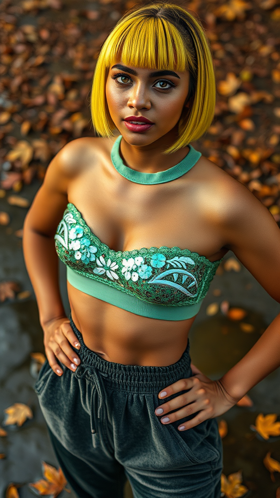 A vibrant documentary photograph captures the essence of autumn fashion through a close-up of a 24-year-old Maranao-Guarani female circus performer. Her expression conveys playful defiance. She has a tight, flat stomach showcasing toned muscle grooves, her golden brown skin emits a subtle warmth, reflecting light softly, showcasing her clearly defined pores and texture. Her deep-set, striking grey cat eyes are framed by long, elegant lashes, beneath a chic bob haircut with bright lime green hair and baby bangs. Softly gradient-shaped brows enhance her delicate features. She wears a dazzling sequin-embellished crop top that catches the light, paired with low-rise velour tracksuit pants, embodying retro street style. Positioned on the left following the rule of thirds, she poses confidently with hands on her waist, a gentle lean enhancing her approachable, friendly vibe. The background adds whimsy, featuring rain boots in a puddle with floating leaves. The scene is lit by soft natural light with fill flash reminiscent of Oskar Fischinger's enigmatic style.
