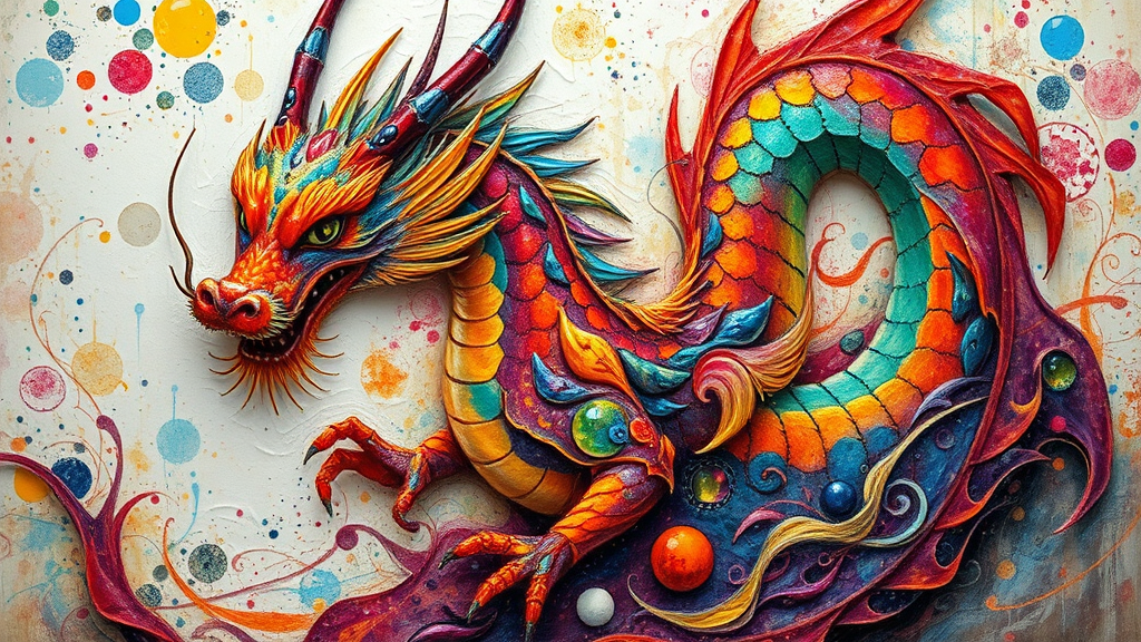 A vibrant dragon shimmering with a kaleidoscope of colors, blending seamlessly into a chaotic yet harmonious fusion of styles reminiscent of Shohei Otomo's intricate detail, Brian Mashburn's atmospheric depth, and Natalia Rak's bold use of color. The image exudes the textured warmth of encaustic art, capturing a sense of spontaneous energy and fluidity akin to marbleized patterns. The dragon's form weaves amidst a tapestry of abstract calligraphy, drawing from the rich aesthetic of Hurufiyya, as its scales glisten like precious gemstones, each reflecting light in a dance of fluid motion.