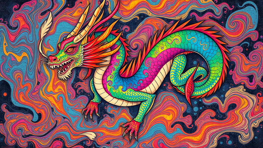 A vibrant dragon swirling with a kaleidoscope of colors, capturing the intense detail of Shohei Otomo and the atmospheric depth of Brian Mashburn; its scales shimmer with the vivid hues reminiscent of Natalia Rak’s murals, set against a swirling, textured background akin to encaustic art. Energetic and dynamic, the dragon’s form is infused with spontaneous energy, intertwining with the abstract, letter-like patterns of Hurufiyya. The overall effect echoes the mesmerizing fluidity of marbleized designs, as the dragon seems to dance and flow across the canvas.