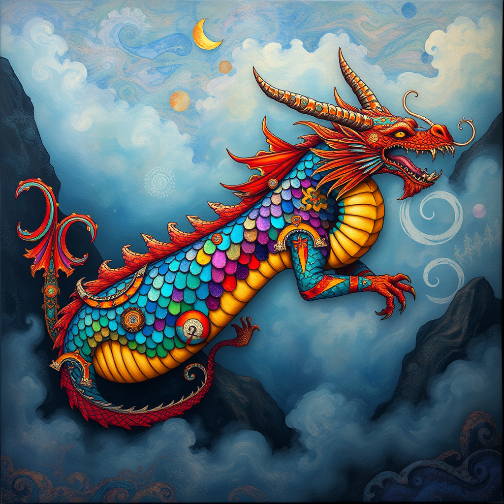 A vibrant dragon with scales reflecting a kaleidoscope of colors, depicted in the intricate, detailed style reminiscent of Shohei Otomo and Brian Mashburn. The dragon weaves through a fog-laden landscape, its presence both ethereal and dynamic, infused with the expressive spontaneity of encaustic art. Elements of Natalia Rak's rich color palette merge with the fluidity of marbleized patterns, creating a mesmerizing visual dance. Enigmatic symbols reminiscent of hurufiyya art subtly embellish the dragon's body, adding an enigmatic depth to the scene. The piece exudes an energetic spontaneity, capturing the essence of a mythical creature in enthralling motion.