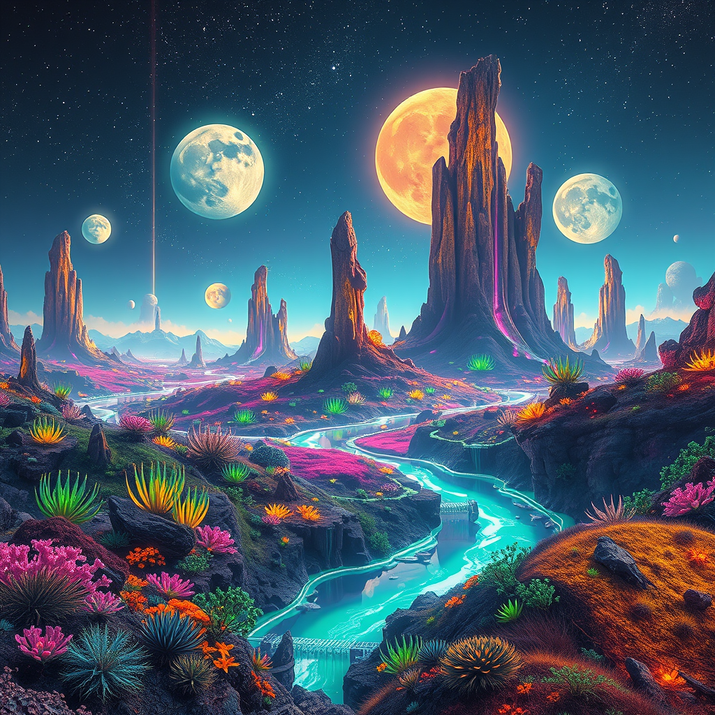 A vibrant extraterrestrial landscape bathed in colorful neon hues with luminescent flora and bioluminescent creatures under a star-filled sky, featuring towering glowing rock formations and a shimmering river reflecting the radiant glow of alien moons, all set within a cinematic wide-angle view.
