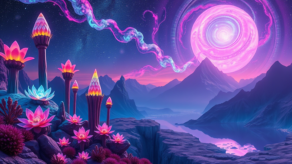 A vibrant extraterrestrial landscape bathed in neon hues, featuring towering luminescent flora and strange glowing creatures under a starry sky with swirling colorful nebulae, all set against a panoramic view of crystalline mountains and reflective lakes.