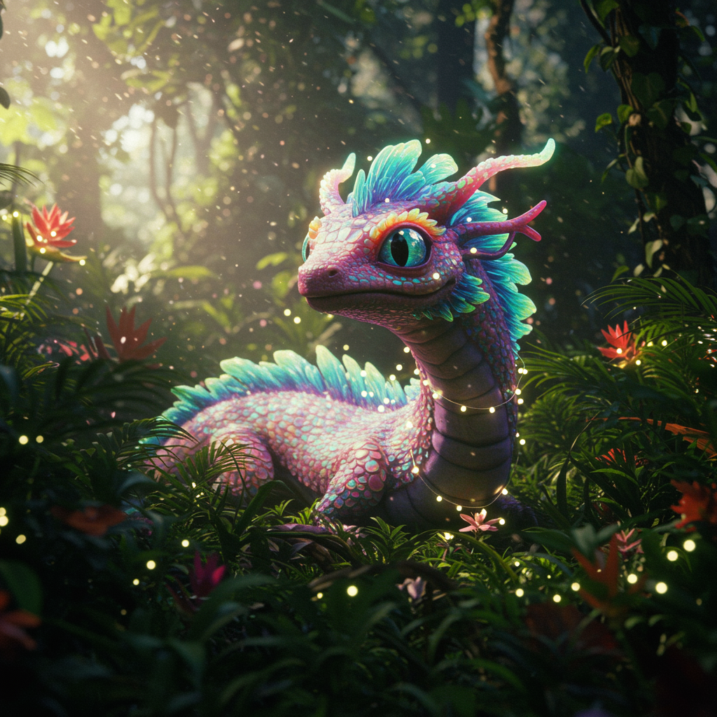 A vibrant, fantastical creature nestled within a lush jungle setting, its iridescent scales shimmering in the dappled sunlight, surrounded by enchanting fairy lights. The scene is captured in striking detail, highlighting the creature's intricate features with photorealistic precision. Bright colors burst from the jungle foliage, while soft volumetric rays of light filter through the canopy, casting magical shadows. The atmosphere glows with an otherworldly HDR brilliance, drawing attention to the creature's mesmerizing, otherworldly eyes.