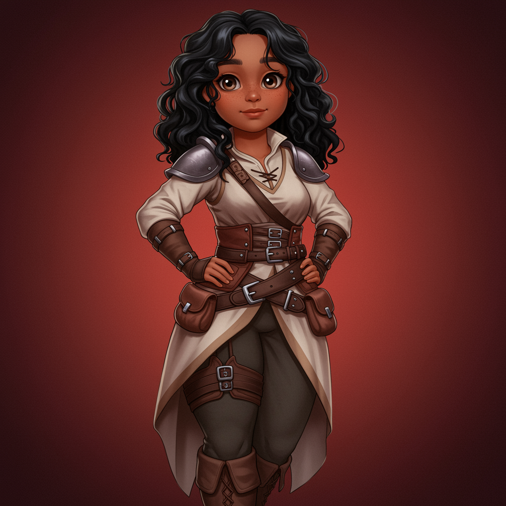 A vibrant fantasy portrait of a charming young female adventurer with wavy black hair and a warm, dark tan complexion. She has large, expressive brown eyes that exude friendliness and intelligence. She stands confidently, showcasing her wide hips and wearing a long, flowing fantasy tunic complemented by cloth tights and leather armor. Her attire is cinched with a thick leather belt adorned with numerous pouches. The atmosphere suggests a fantasy genre with ultra-high-definition and high dynamic range, capturing her in exquisite detail. The scene maintains a clean and focused composition, emphasizing her adventurous spirit without modern elements or visual distractions.
