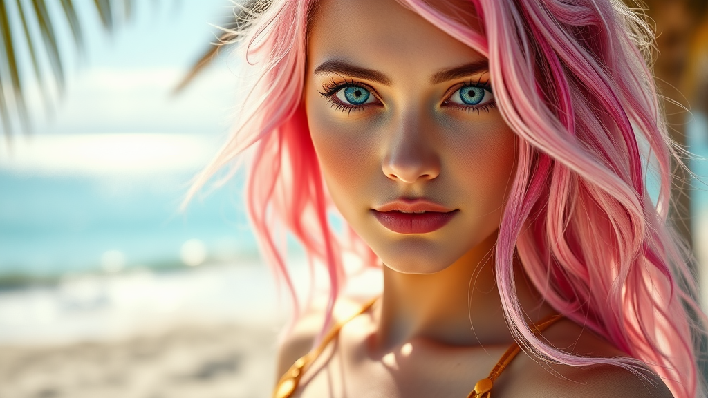 A vibrant fashion photography portrait featuring a charming girl with shimmering pink hair and blue eyes on a tropical beach, wearing a gold bikini. The scene captures sunlight filtering through her hair with a soft bokeh effect in the background. Her skin texture is impeccably smooth and detailed, resembling a 3D render captured through a 35mm lens. The image is enhanced with film grain for a cinematic feel, presented in 16k UHD HDR for striking clarity.