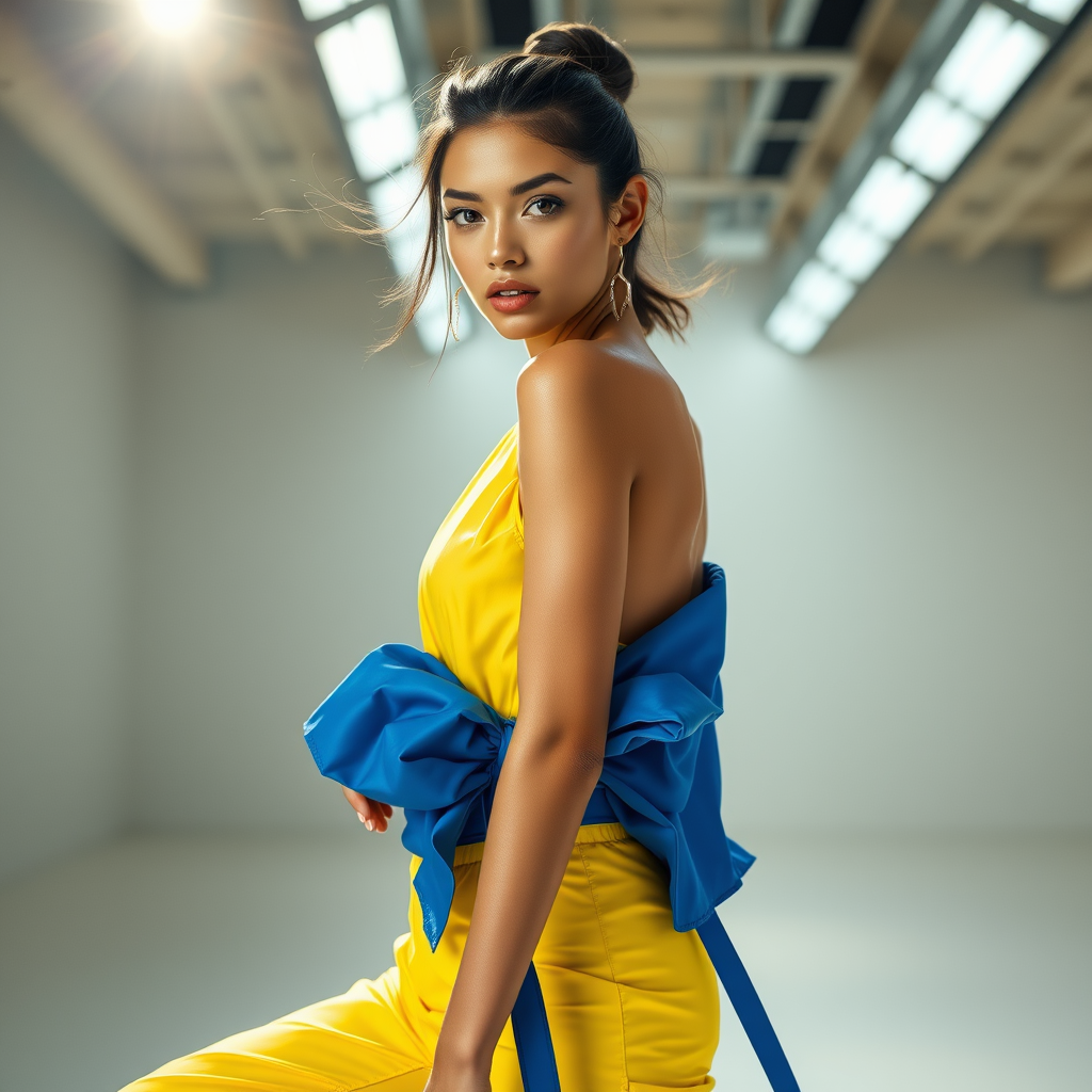 A vibrant fashion shoot featuring an exceptionally stunning female model in a striking pose, adorned in a yellow and blue ensemble designed by Craig Green, Dingyun Zhang, Yeezy, Balenciaga, and Off-White. The scene is bathed in bright lighting, capturing every detail with sharp focus and vivid clarity. The composition is cinematic, glamorous, symmetrical, and reminiscent of a Vogue editorial, with an emphasis on detailed, high-fashion aesthetics worthy of a magazine spread.