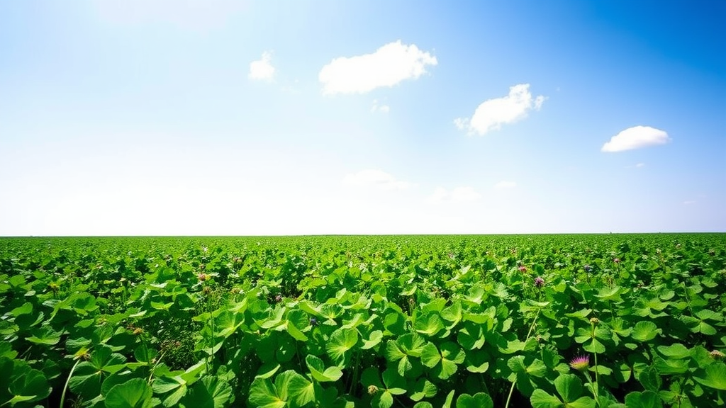 A vibrant field of clovers under a bright blue sky, with a gentle breeze causing subtle ripples across the sea of green. The scene stretches into the horizon, capturing the essence of serenity and nature's simple beauty. Splashes of wildflowers add bursts of color, contrasting with the rich clovers, while a few fluffy clouds drift lazily above, enhancing the tranquil atmosphere. The peacefulness of the landscape invites a sense of relaxation and wonder, encapsulating the magic of a perfect spring day.