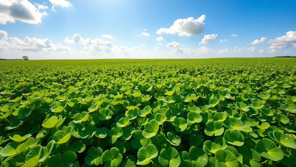 A vibrant field of lush, green clovers stretching to the horizon under a bright, clear blue sky, captured in a wide panoramic view that emphasizes the vastness of the landscape. Sunlight filters through fluffy white clouds, casting playful shadows on the clovers. A gentle breeze creates subtle waves across the field, adding a sense of movement and tranquility to the scene. Delicate dew drops glisten on the leaves, reflecting the morning light and adding a touch of enchantment to the idyllic setting.