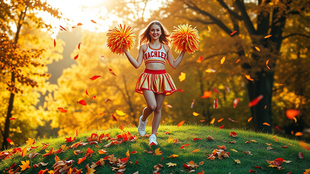 A vibrant figure dressed as a cheerleader stands confidently amidst the swirl of fallen autumn leaves, each gust lifting a colorful array around her like a natural confetti. Her outfit sparkles under the soft, golden sunlight filtering through the trees, as she balances effortlessly on a grassy hill, the gentle breeze playing with the fringes of her pom-poms.
