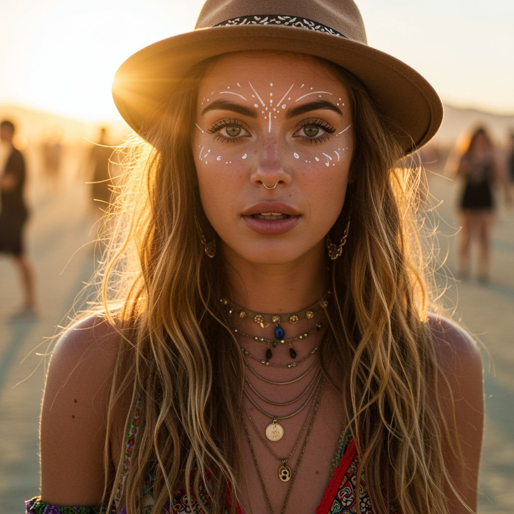 A vibrant, free-spirited woman with long flowing hair and striking, expressive eyes gazes directly into the camera. Her full lips are accentuated by the golden sunlight of a festival setting, capturing the lively essence of Coachella and the artistic spirit of Burning Man. She embodies a bohemian chic style, adorned in colorful, eclectic festival attire that reflects a fusion of cultures and creativity. The scene is highly detailed, rich in texture and color, as though captured in stunning 8k resolution, with an immersive, HDR quality that makes every element of the image come alive.