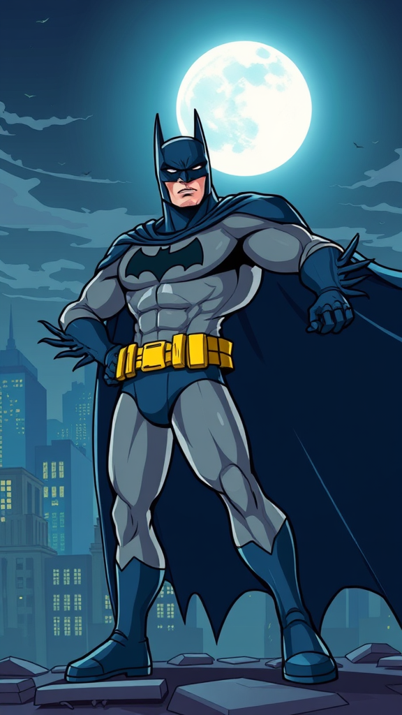 A vibrant, full-body illustration of Batman in a cartoon comic style, showcasing a sleek yet simple design with minimal detailing. The Caped Crusader strikes a dynamic pose, exuding energy and readiness, with his iconic cape flowing dramatically. The scene is depicted in ultra-high resolution, capturing every nuanced shadow and highlight on his costume. Bright moonlight casts an atmospheric glow, enhancing the Gotham skyline in the background.