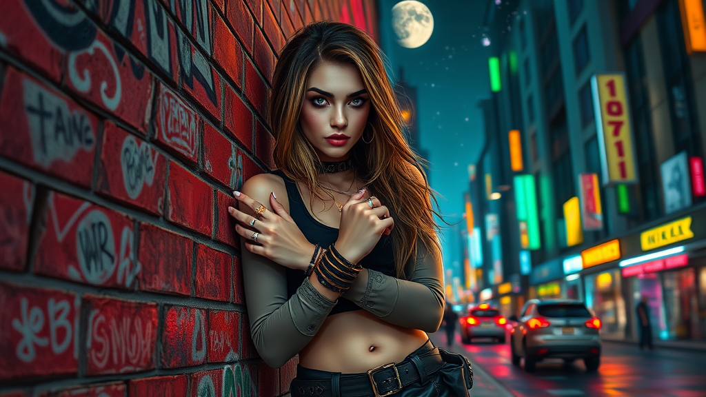 A vibrant full-body portrait of a cyberpunk woman leaning against a graffiti-adorned brick wall in the heart of a buzzing futuristic city street at night. The scene is illuminated by the kaleidoscope of city lights and colored lighting, while the stars and moon subtly glimmer in the sky. The woman has a detailed symmetrical face featuring a captivating scowl, accompanied by long, flowing hair. Her look is distinctly punk, with reflective eyes and artful makeup. The woman wears long sleeves and various bracelets, and her fingers are decorated with many rings. She has ear piercings and sports a bold face tattoo. Her ensemble includes bulky, muddy boots, fitting her alt-girl vibe perfectly. Intricate chiaroscuro and rim lighting add depth to the dramatic lighting of the scene. The inspiration draws from professional majestic impressionism, reminiscent of artists like Waterhouse and John Constable, and nods to the storytelling of Studio Ghibli, channeled through the stylistic lens of creators like Makoto Shinkai and Jeremy Mann. This piece is meant to be a trending masterpiece on platforms like ArtStation and CGSociety. The mixed-media aesthetic draws from high detail and dramatic compositions, intentionally avoiding any exaggerated or surreal distortions while maintaining the integrity of punk and cyberpunk themes.