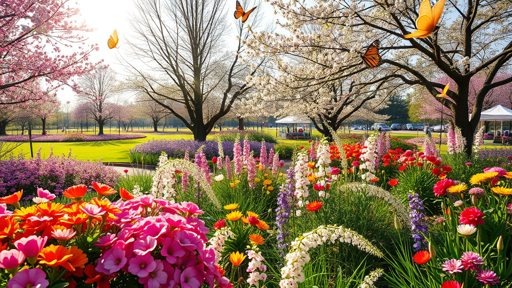 A vibrant garden bursting with colorful blooms in a picturesque spring landscape, sunlight dappling through the leaves of blossoming trees, a gentle breeze carrying the sweet fragrance of flowers, butterflies dancing in the air, serene and joyful ambiance, scene set in a wide, panoramic view showcasing the blissful essence of springtime joy.