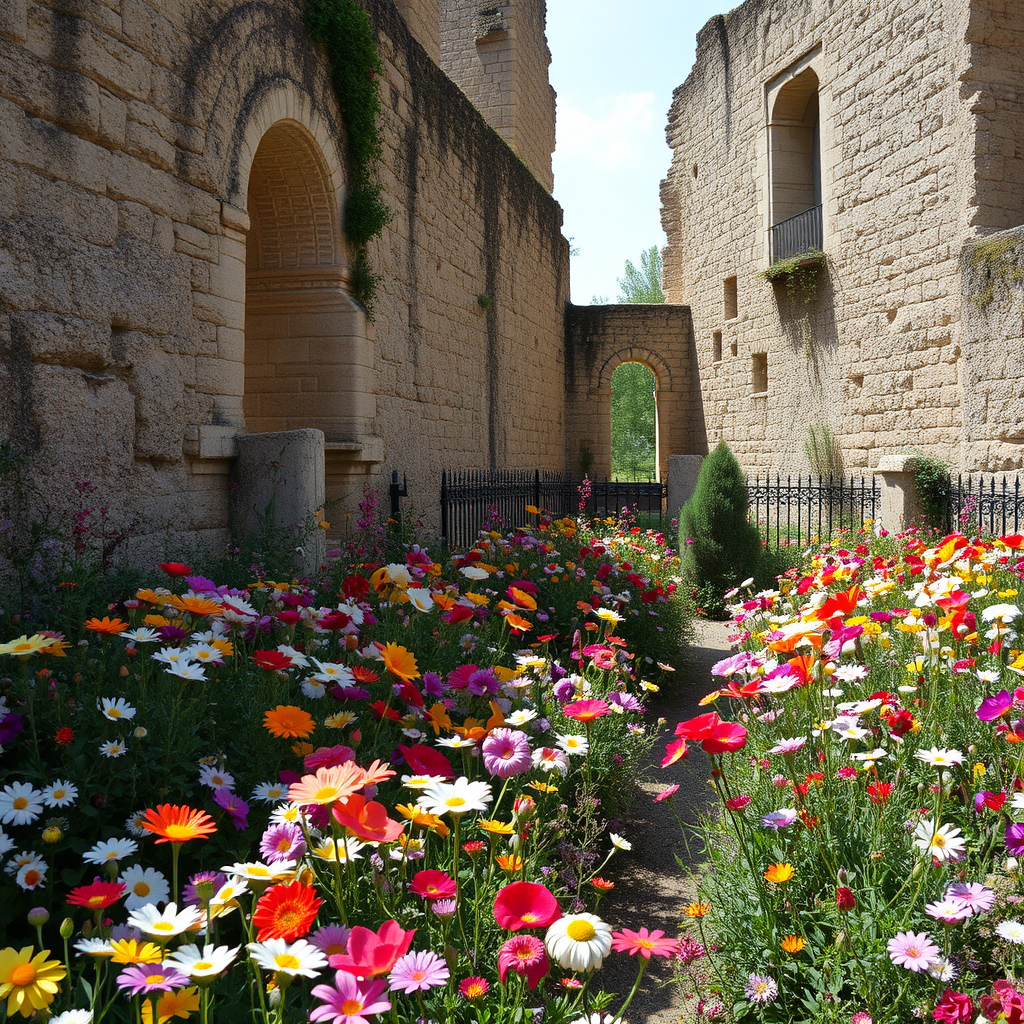 A vibrant garden teeming with an explosion of colorful flowers intertwines with the weathered elegance of ancient ruins, artfully reminiscent of the styles of Paulina Góra and Rachel Ruysch, with delicate petals juxtaposed against the timeless stone, soft natural light casting gentle shadows, and a sense of harmonious decay that infuses the scene with a serene yet dynamic beauty.