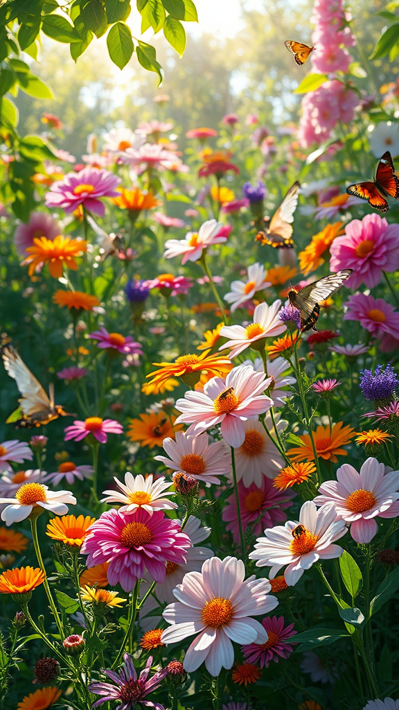 A vibrant garden teeming with an explosion of colorful flowers, each bloom meticulously detailed and displaying delicate textures, inspired by the intricate beauty of Paulina Góra and Rachel Ruysch's work. Sunlight filters through the leaves, casting a gentle glow over the scene, and the serene atmosphere is accentuated by the soft buzzing of bees and fluttering butterflies. Lush greenery surrounds the flowers, while a gentle breeze carries the sweet scent of blooms, creating a harmonious balance between wild nature and artistic elegance.