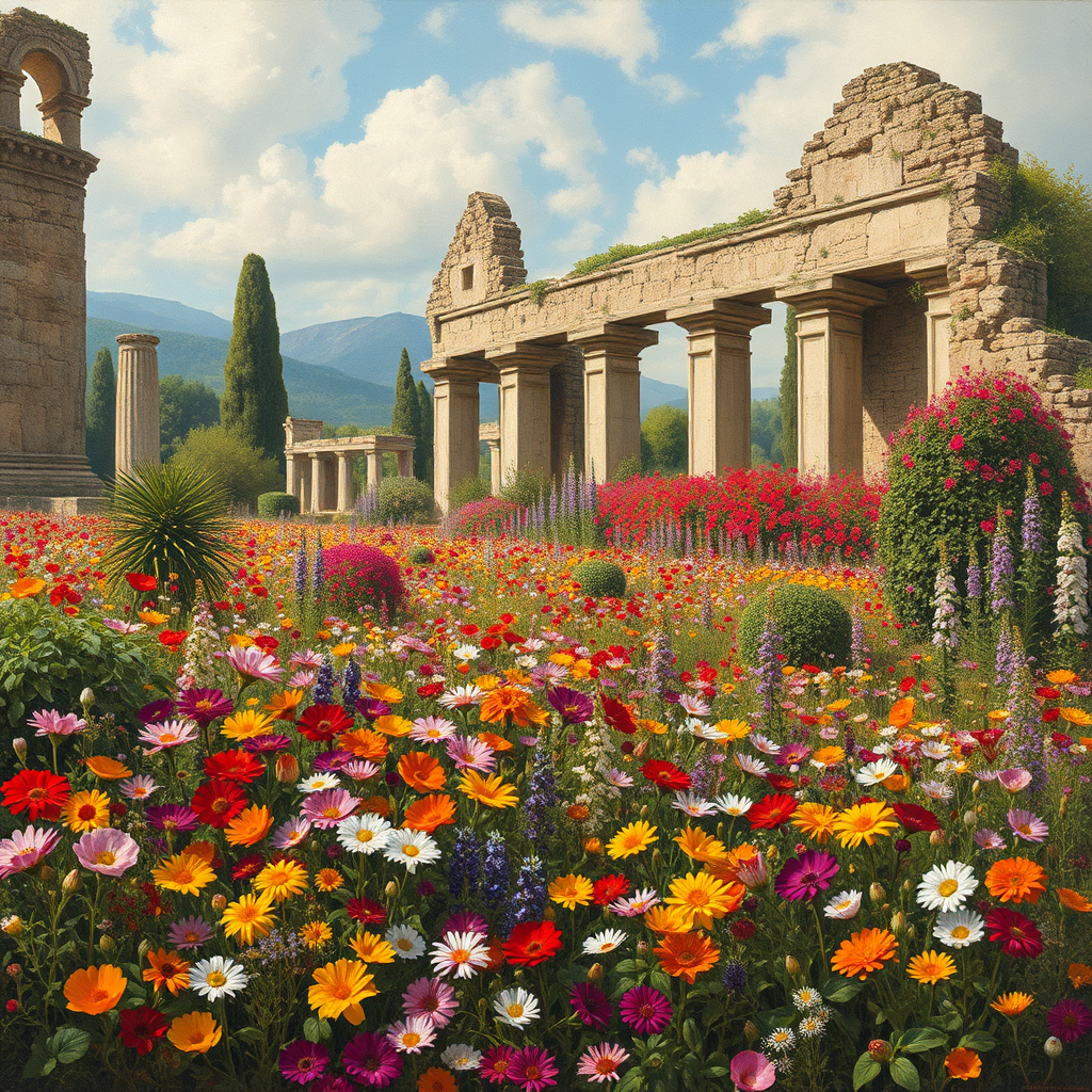 A vibrant garden teeming with an explosion of colorful flowers, intertwined with ancient ruins, captured in the artistic styles of Paulina Góra and Rachel Ruysch, where delicate floral details and lush landscapes blend with the weathered elegance of historical remnants, creating a harmonious fusion of nature and antiquity.