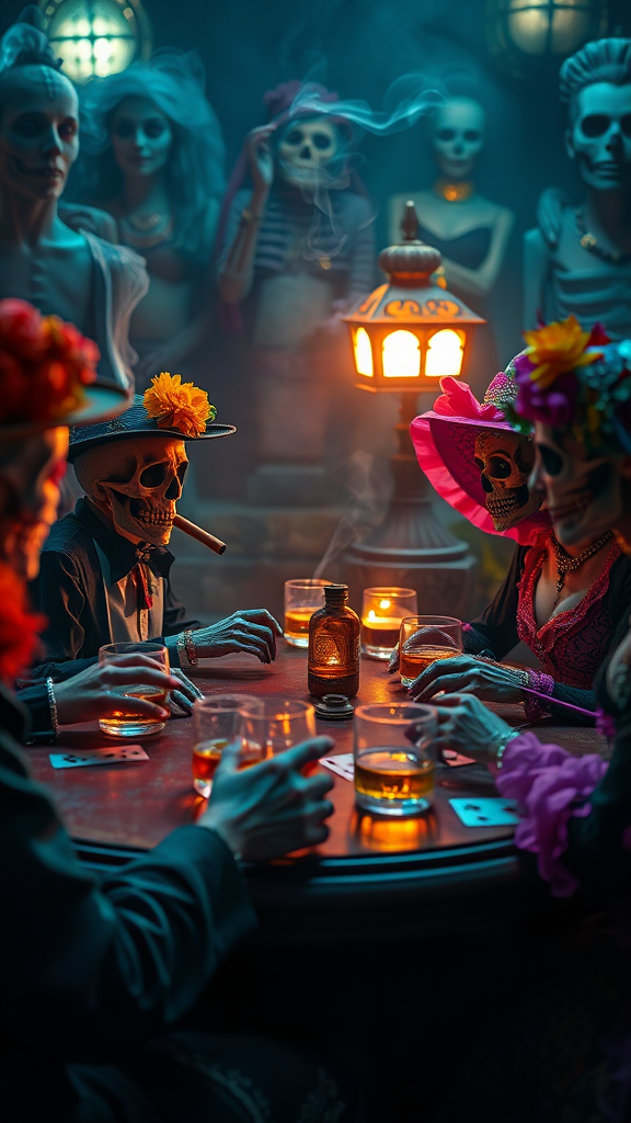 A vibrant gathering in a mystical cemetery unfolds as a group of colorful calaveras and elegant Catrinas engage in a thrilling poker game during Día de Muertos. The air is thick with swirling cigar smoke, while gleaming whisky glasses clink softly on the table, casting a cinematic, eerie glow across the scene. The atmosphere is reminiscent of Tim Burton's unique style, blending sharp focus with a magical bokeh effect. The vivid colors burst forth in stunning UHD and HDR10 quality, depicted in Absurdres resolution. The scene captures the haunting beauty and lively spirit of the Mexican Day of the Dead, without distracting elements like borders or digital artifacts, creating a seamless, richly detailed composition.