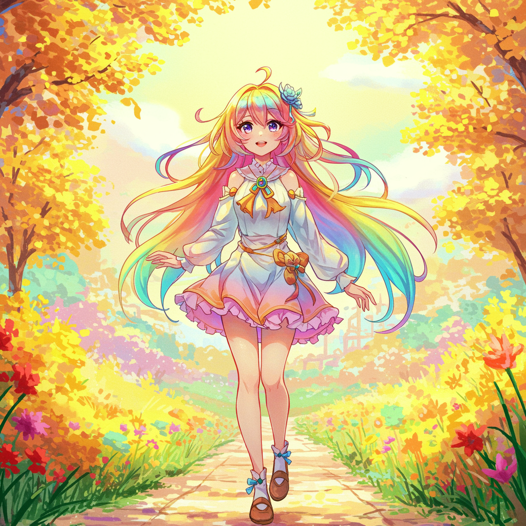 A vibrant girl with a cascade of colorful hair stands gracefully within a bright and lively painting, drawing inspiration from the enchanting style of Yanjun Cheng. Her appearance reflects charming anime characters and fantasy-inspired art, blending seamlessly with hues of yellow and cyan. The scene is rendered in exquisite 32k ultra-high definition, featuring ethereal figures that exude a dreamlike quality, evoking the whimsy and enchantment of rainbowcore aesthetics.