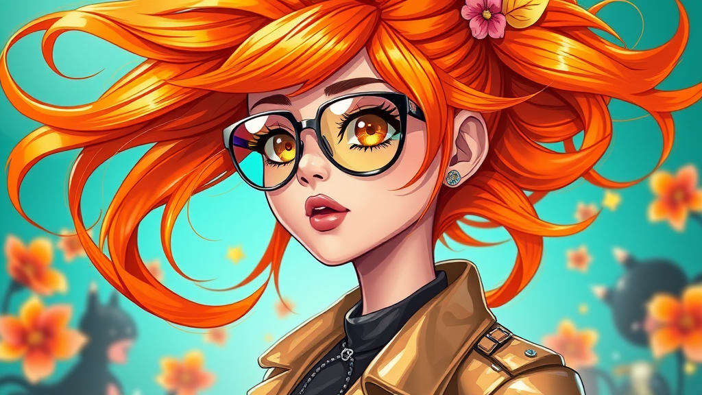 A vibrant girl with flowing orange hair and sleek glasses, depicted in a futuristic digital art style. She is adorned in flowerpunk fashion, exuding a shiny and glossy appearance. Her attire and background feature a striking contrast of dark teal and orange hues. The scene captures charming characters set in a lively, colorful world, where her energetic presence is highlighted by dynamic elements and playful aesthetics.