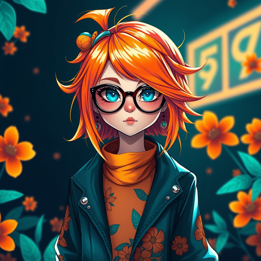 A vibrant girl with striking orange hair and chic glasses stands confidently, embodying the essence of futuristic digital art. Her style merges the organic flow of flowerpunk with a glossy, high-tech finish. The color palette intertwines dark teal and luminous orange, creating a captivating contrast. This charming character exudes energy and charisma, surrounded by an atmosphere of lively and dynamic colors that enhance her unique presence. Her attire blends botanical patterns with sleek, modern design, giving her an otherworldly yet relatable appeal.