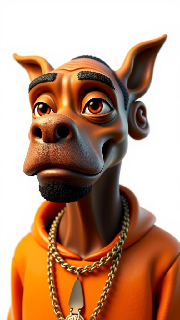 A vibrant, glazed 3D render of Snoop Dogg in a Pixar-Disney fusion style, featuring intricately detailed textured skin and expressive, detailed eyes. The character stands against a pristine white background, showcasing the artistry and high-resolution finesse of 8k quality, embodying a beautiful blend of realism and animation. Subtle creative touches infuse the depiction with life, highlighting the humor and charm synonymous with iconic animated classics.