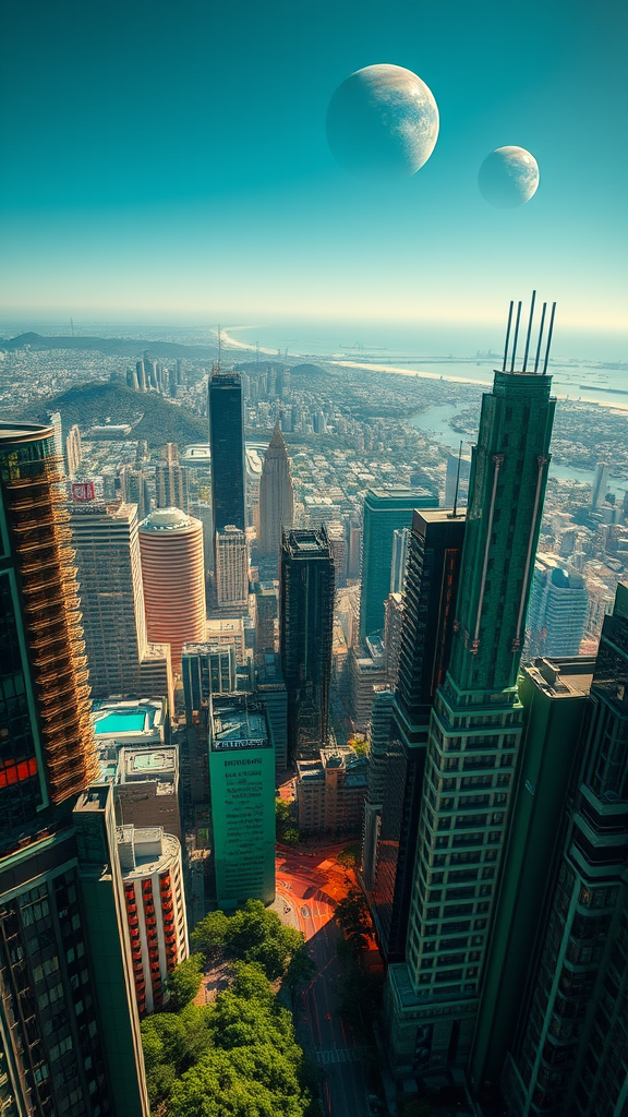 A vibrant green city emerges amidst an Australian landscape, set against a backdrop of distant planetary spheres. The eroded interiors of the city's buildings reveal a fusion of hyper-realistic details bathed in light red and orange hues, captured with the precision of a Nikon D750. Transfixing marine scenes interplay with the urban fabric, amplified by natural light to create a masterpiece of realistic hyper-detailed rendering. The sweeping vistas and atmospheric elements coalesce in an ultra-high definition presentation, weaving a narrative of nature intertwined within futuristic elegance.