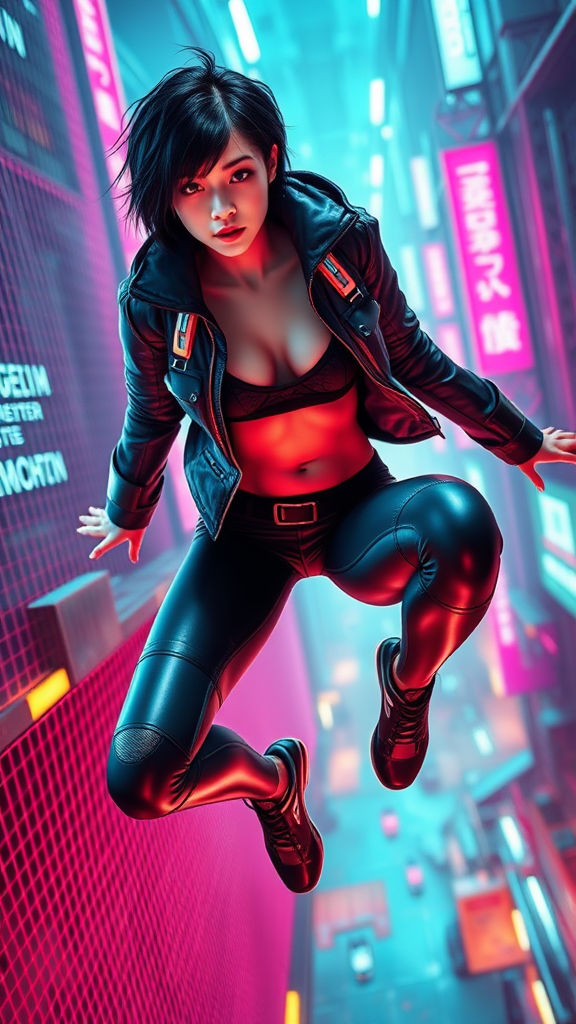 A vibrant, high-contrast image of a young Asian female supermodel with a slim build and defined abs, featuring small breasts and a flat chest. Her short, messy black hair complements her futuristic look. She's clad in a Nano-weapon concealment jacket with a midriff design and Biometric lockdown leggings, skillfully navigating a superhuman parkour sequence. The background is a neon-lit, dystopian setting—a Nanotech contamination quarantine zone. The scene is rich in detail and resonates with the essence of cyberpunk genre video games, offering a digital and dynamic snapshot of a futuristic world.
