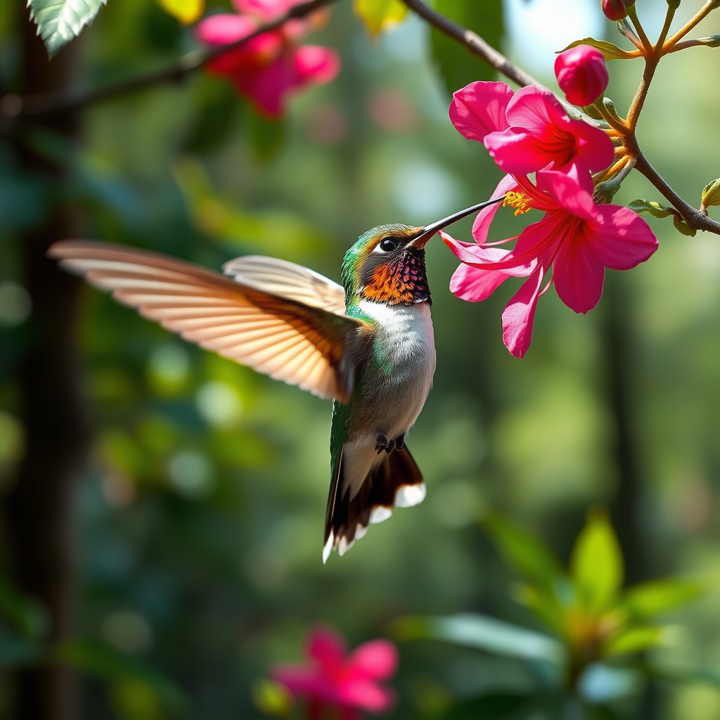A vibrant hummingbird hovering near a blossoming flower, captured in a stunning masterpiece of motion, with a dynamic pose from a side angle. It's set against a lush forest backdrop, bathed in natural light. The scene is photorealistic, showcasing the exquisite details and hyper-realism of wildlife photography, with meticulous accuracy and high resolution, creating a breathtakingly detailed and vivid image at 32k clarity and a 5:7 aspect ratio.