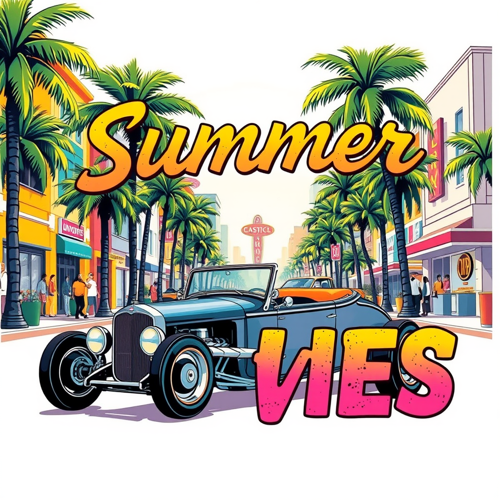 A vibrant illustration captures a vintage hot rod cruising down a sunlit street lined with swaying palm trees. The lively cityscape in the backdrop features colorful buildings, a bright neon sign, and a bustling crowd enjoying the day. The phrase 'Summer Vibes' is prominently displayed in a retro, distressed style, with each letter in a different vibrant hue, evoking a sense of nostalgia. This design is ideal for a t-shirt print, set against a clean white background, encapsulating the essence of carefree, sun-soaked days.