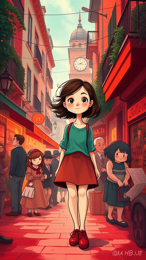 A vibrant illustration captures the spirit of a girl strolling down a bustling street, drawing inspiration from early Disney animation and the lively essence of the pre-World War II School of Paris. Her surroundings are enveloped in rich hues of red and emerald, bringing an enchanting quality to the scene. The characters she encounters are whimsical caricatures, exuding charm and personality. The backdrop is shrouded in an air of mystery, hinting at untold stories and secrets. Around her, lively tableaus depicting everyday life unfold, adding a sense of motion and vivacity. The composition is presented in a stunning 32k UHD, with an aspect ratio of 1:2, heightening its immersive quality. The style is elegantly stylized, adding an artistic flair to the scene, breathing life and vibrancy into every detail.