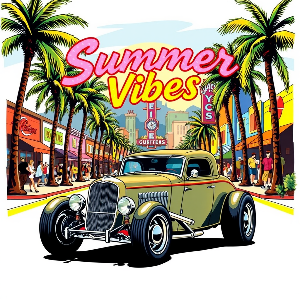 A vibrant illustration depicting a vintage hot rod cruising down a sunny street lined with swaying palm trees. The retro cityscape in the backdrop features colorful buildings, a glowing neon sign, and a lively crowd of people enjoying the day. The phrase 'Summer Vibes' is styled in a retro, distressed font, with each letter in a different vibrant color, evoking a sense of nostalgia. The design serves as an excellent t-shirt print concept, set against a clean, white background.