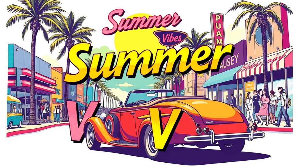 A vibrant illustration featuring a classic vintage hot rod cruising down a sunny street lined with tall palm trees. The retro cityscape in the background showcases colorful mid-century buildings, an eye-catching neon sign, and a bustling crowd of people dressed in 50s fashion. The text 'Summer Vibes' is displayed in a retro, distressed style with each letter in a different bright color, exuding a sense of nostalgia. This design is ideal for a t-shirt print with a clean white background.