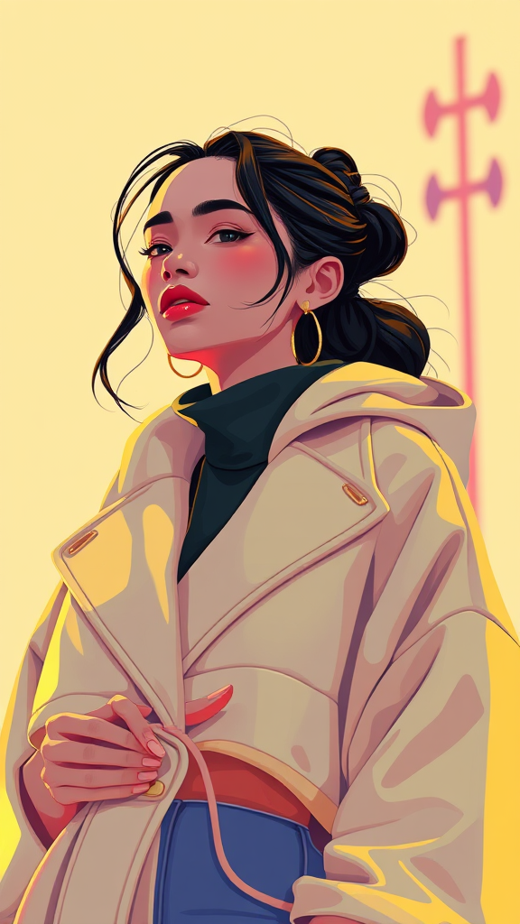 A vibrant illustration featuring a woman adorned in a contemporary poncho jacket, echoing Duro Olowu's aesthetic flair. The artwork blends inspirations from Yanjun Cheng's style with the nostalgic appeal of a lofi girl meme. It boasts a captivating 3D render quality reminiscent of Beeple's work, with the whimsical charm of Rhads and Lois van Baarle's cartoon illustrations. The piece exudes bright pastel colors, invoking the nostalgic feel of retro anime, and could easily be trending on Dezeen. The scene captures a modern catalog photo essence, presenting a beautiful fusion of past and present.