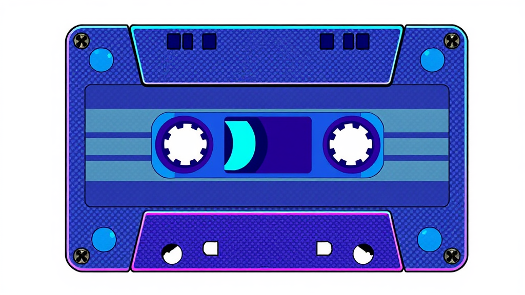 A vibrant illustration of a classic cassette tape in a carbon fiber aesthetic, blending shades of blue and purple, inspired by the pop art style of Roy Lichtenstein, set against a clean white background, with subtle halftone patterns and bold outlines for a retro-futuristic vibe.