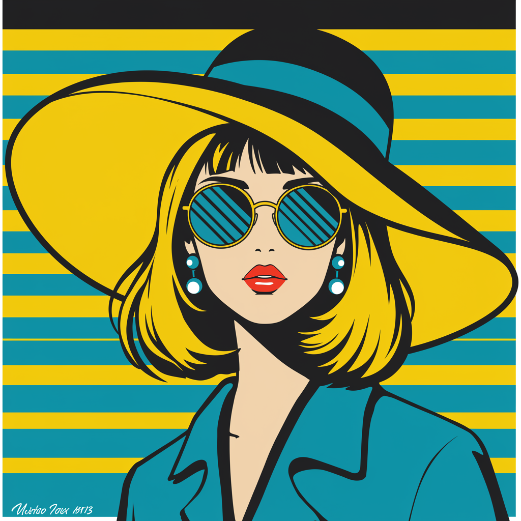 A vibrant illustration of a girl in stylish sunglasses and a chic hat, inspired by Mike Deodato's bold and colorful graphic design. The image features dominant hues of yellow and azure, evoking a retro yet modern aesthetic from 1970 to the present. The artwork incorporates striped patterns, emphasizing a sense of movement and energy. Set in ultra-high definition, this image is perfect for showcasing in #myportfolio with its dynamic and engaging composition.