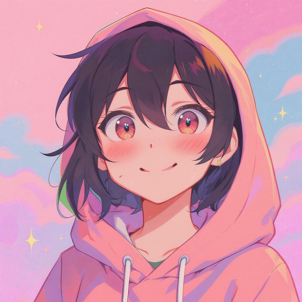 A vibrant illustration of a person wearing a hoodie, inspired by the digital artistry of Yanjun Cheng, Beeple, Rhads, and Lois van Baarle. The style is cartoon-like, featuring bright pastel colors and an enchanting retro anime aesthetic. The close-up captures the person's expressive eyes and playful expression, set against a dreamy, pastel-colored background that adds depth and warmth to the scene.