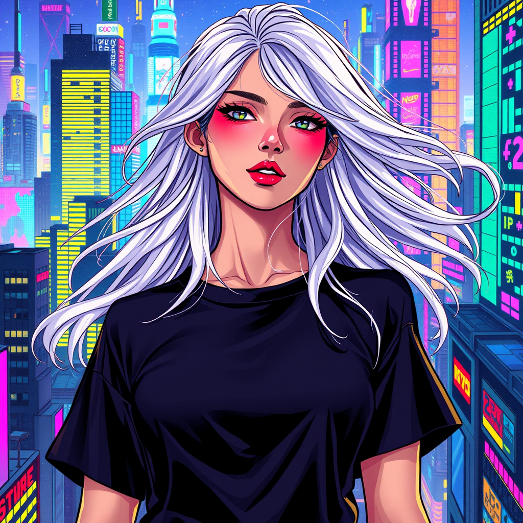 A vibrant illustration of a woman with flowing white hair, wearing a sleek black t-shirt, set in a colorful fantasy cyberpunk cityscape. The style combines elements of dynamic manga, the rich detail of Hans Zatzka's works, and the intricate beauty of stained-glass art. Infused with a Marvel comics flair and the vibrant muralist approach of Yanjun Cheng, the scene depicts a futuristic skyline glowing with neon lights. The woman stands confidently, her hair illuminated in the city lights, with colorful reflections casting abstract patterns across her face and attire, adding layers of depth and mystique, in a tall, vertical composition.