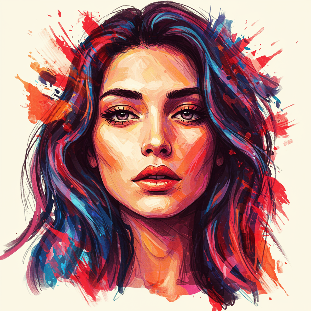 A vibrant illustration of a woman's face, featuring an array of bold colors and dynamic brush strokes, capturing an air of mystery and emotion. The composition is elongated, emphasizing an abstract elegance with flowing lines and intricate patterns that echo a sense of chaos and beauty. The artistic style merges surreal and impressionistic elements, creating a dreamlike ambiance heightened by the intense hues and fluid textures.