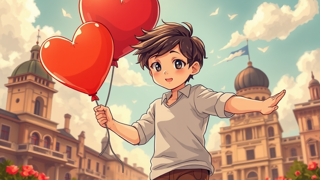 a vibrant illustration of a young boy in a dynamic pose, holding a heart-shaped balloon against a backdrop of romantic academia elements, depicted in sketchfab and poodlepunk style, warm tones envelop the scene, featuring romanticized figures and expressive comic panels, the design exudes a timeless charm with hdr effects enhancing the rich textures, captured in sharp focus with 32k resolution, soft clouds in the background, a gentle breeze subtly animating the boy’s hair, sunlight casting playful shadows around him