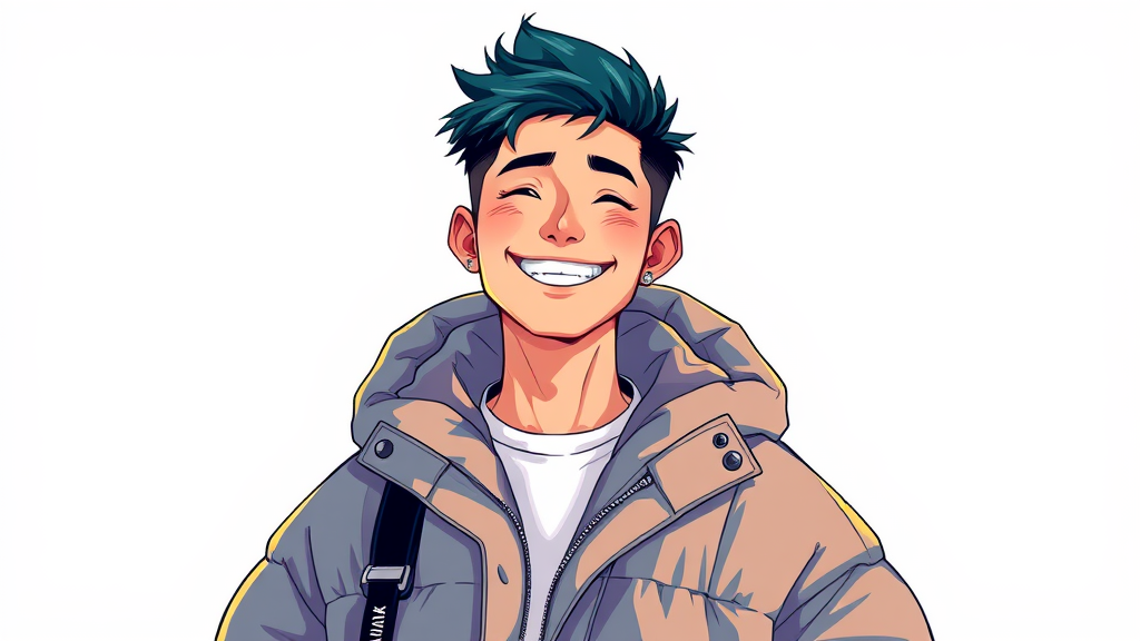A vibrant illustration of a young man with a cheerful expression, dressed in an oversized puffer jacket resembling a stylish poncho, channeling Off-White vibes. The piece draws inspiration from the lo-fi aesthetic of early internet memes and Tumblr culture, combined with the artistic flair reminiscent of Yanjun Cheng. The art is a striking blend of digital rendering and cartoon style, capturing the essence of artists like Beeple, Rhads, and Lois van Baarle. It features bright, eye-catching colors in a retro anime style and is designed to fit within a modern catalog photo. Trending on design platforms such as Dezeen, it portrays an innovative blend of contemporary and nostalgic elements, staying true to its core theme while adding a touch of creative whimsy.