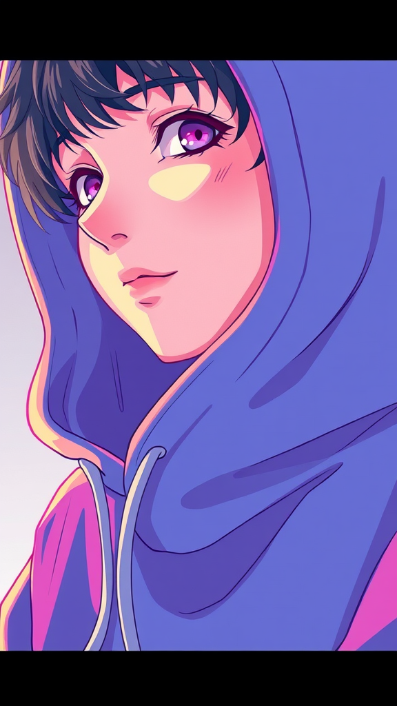 A vibrant illustration showcases a close-up of a person in a hoodie, influenced by digital artists like Yanjun Cheng, Beeple, Rhads, and Lois van Baarle. The artwork exudes a retro anime vibe with its cartoon-like style and bright pastel colors, presenting an enchanting and nostalgic depiction reminiscent of a classic anime character.