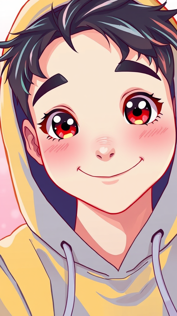 A vibrant illustration showcases a close-up of a person in a hoodie, drawing inspiration from digital artists like Yanjun Cheng, Beeple, Rhads, and Lois van Baarle. The artwork exudes a cartoon-like charm with bright pastel colors, reminiscent of a retro anime character. The person's expression is whimsical and playful, with large, expressive eyes and a slight smile, set against a soft, dreamy background that adds a nostalgic yet modern twist.