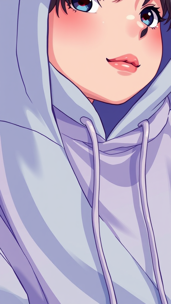 A vibrant illustration showcases a close-up of a person wearing a hoodie, drawing inspiration from digital artists like Yanjun Cheng, Beeple, Rhads, and Lois van Baarle. The cartoon-like style features a palette of bright pastel colors, creating a striking retro anime vibe. The artwork is characterized by its playful and dynamic energy, with an emphasis on soft lines and a smooth texture that highlights the expressive features of the character and the cozy, oversized fit of the hoodie.