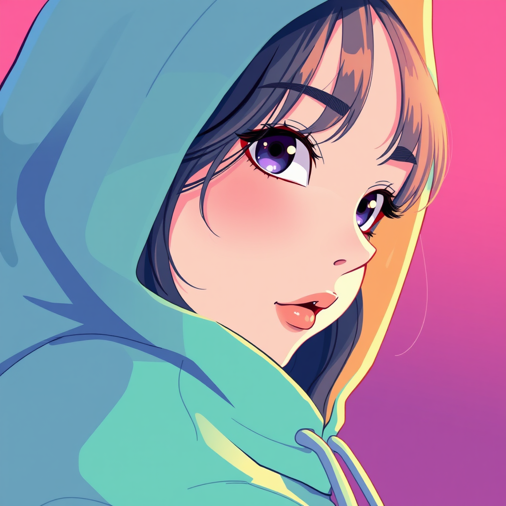 A vibrant illustration showcases a close-up of a person donning a hoodie, drawing inspiration from digital artist Yanjun Cheng alongside influences from Beeple, Rhads, and Lois van Baarle. The artwork exhibits a cartoon-like style infused with vivid pastel colors, capturing the essence of a retro anime girl with a whimsical twist. The piece emanates a playful yet nostalgic aura, blending modern digital artistry with classic anime elements.