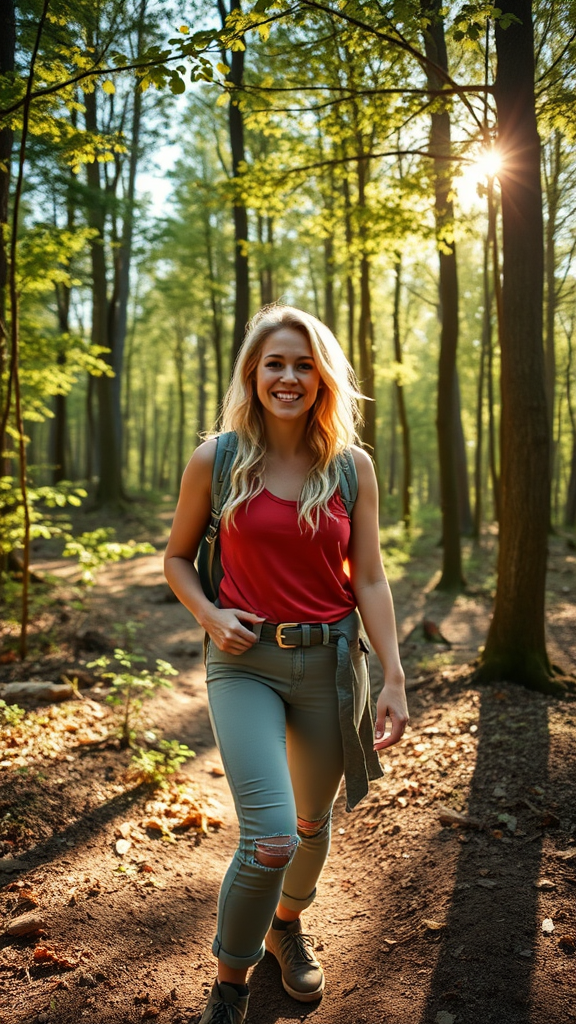A vibrant image capturing a blonde Instagram influencer enjoying a peaceful hike in the woods on a sunny, warm day. The sunlight filters through the trees, casting playful patterns on the forest floor. Her casual yet stylish hiking attire blends seamlessly with the natural surroundings, as she pauses to take a candid moment, smiling and appreciating the tranquility of the forest. The atmosphere is serene, with a gentle breeze rustling the leaves, creating a harmonious connection between the influencer and nature.