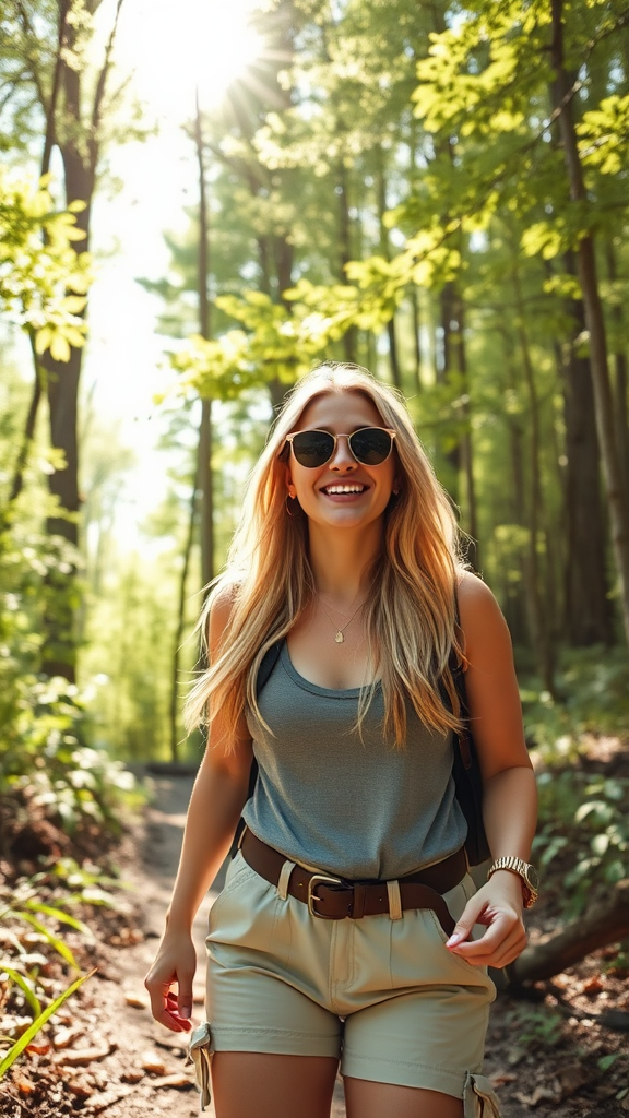A vibrant image capturing a blonde social media influencer enjoying a hike through lush, sun-drenched woods on a warm, clear day, her fashionable outdoor attire complementing the natural beauty around her, radiating enthusiasm and a sense of adventure, with dappled sunlight filtering through the trees creating playful patterns on the forest floor.