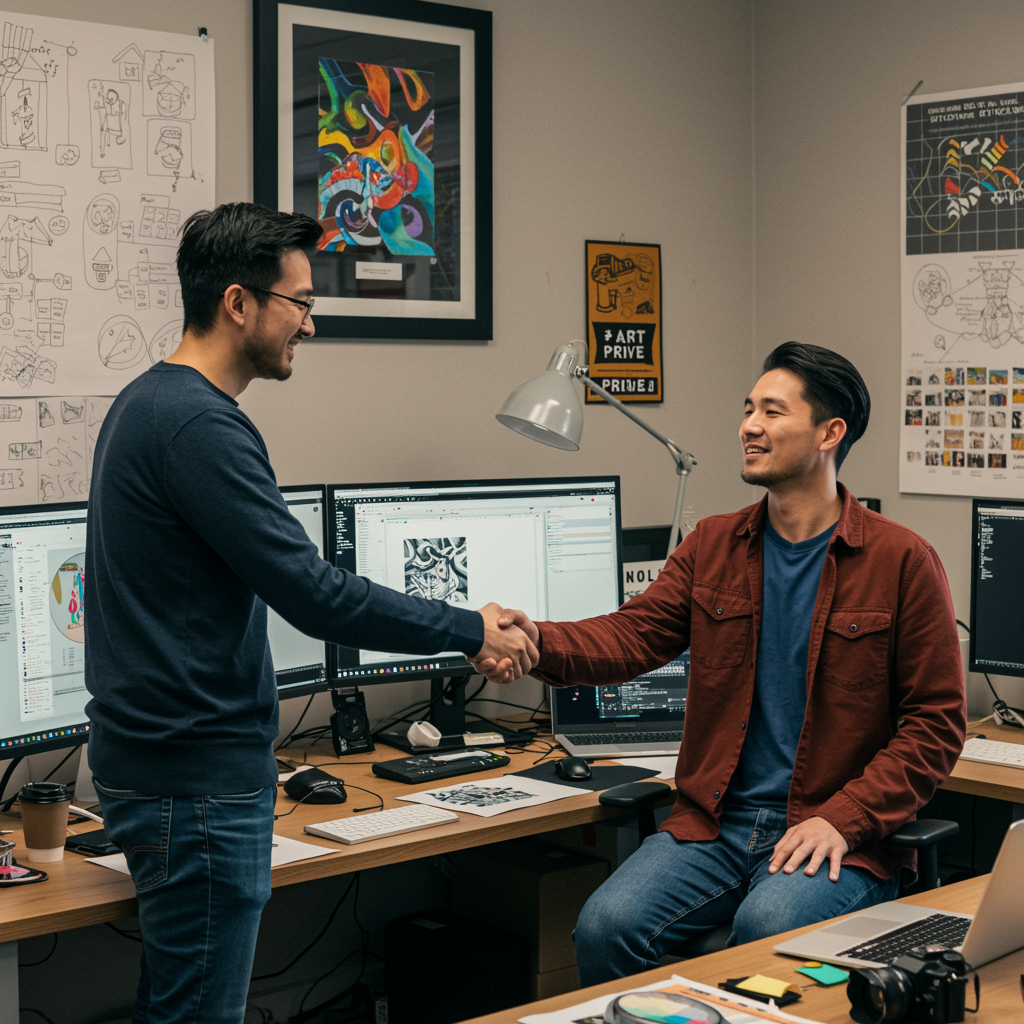 A vibrant image capturing a satisfied customer and a skilled graphic designer shaking hands in a bustling design studio. The workspace is filled with state-of-the-art computers, sleek laptops, and high-end cameras. On the wall, an eye-catching art prize proudly showcases the designer's recent masterpiece. The atmosphere is one of creativity and collaboration, with sketches and design concepts scattered across the desks, reflecting the dynamic nature of the studio. The overall scene exudes a sense of accomplishment and artistic flair.