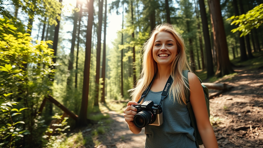 A vibrant image of a blonde social media influencer exploring a forest trail on a warm, sunny day, capturing the essence of nature's beauty with a radiant smile, her modern hiking gear blending style and comfort, surrounded by lush green foliage and dappled sunlight filtering through the tall trees, a sense of adventure and joy exuding from her as she pauses to admire the scenery, her camera in hand to document the moment for her followers.
