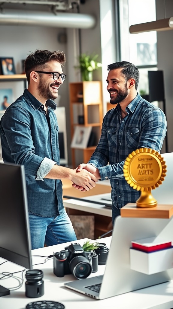 A vibrant image of a delighted customer enthusiastically shaking hands with a talented graphic designer in a modern design studio filled with cutting-edge technology. Sleek computers and laptops are arranged alongside professional cameras, showcasing the tools of the trade. On a nearby shelf, a prestigious art prize proudly gleams, celebrating a recent masterpiece. The atmosphere is charged with creativity, as natural light streams through the windows, highlighting the contemporary decor and inspiring environment.